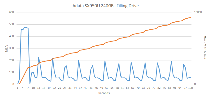 240GB-modellen lyckas bara hålla skrivprestandan hög under en väldigt kort stund. Vi kan bara skriva ungefär 2GB med data innan prestandan sjunker, och tyvärr sjunker den ganska rejält. Det ser också ut som att alla skrivningar måste göras till SLC. Det betyder att ny data måste invänta att cachen töms till TLC innan den går vidare. Detta är ett bra sätt att minska slitaget på minneskretsarna. 3D-TLC tål dock betydligt mer än gamla 2D-TLC så ska det inte vara något problem och Adata borde istället ha implementerat att ny data skrivs till TLC direkt när SLC-delen är full. Istället får vi riktigt dålig prestanda så fort cachen är full.
