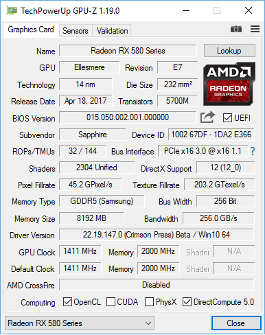 | Arkitketur | Polaris 20 XTX (GCN 4) | Polaris 20 XTX (GCN 4) | Polaris 20 XTX (GCN 4) | Polaris 20 XL (GCN 4) | Polaris 20 XL (GCN 4) |