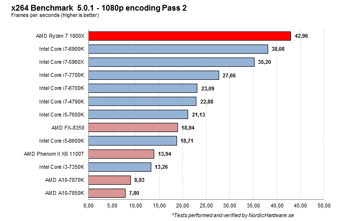 Här noterar vi en intressant kontrast. Första rundan X264 får Ryzen 7 1800X se sig slagen, men andra rundan toppar den listan.