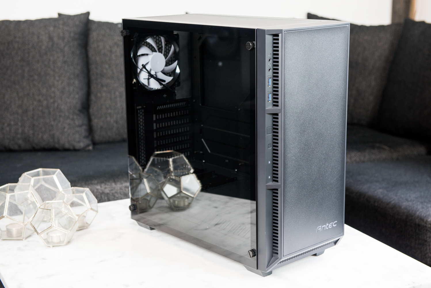 Antec P8 tillhör som vi tidigare nämnt Performance One-serien, men trots detta så är det inte likt något tidigare chassi i serien utan för in en ny design. P8 har en kaxig men samtidigt minimalistisk design runt om, där det kaxiga kommer in i form av härdat glas och hur luftintagen i fronten är designade. Hela chassit är i svartlackerat plåt förutom fronten som till större delen är tillverkad i svart plast och den härdade glasskivan som utgör chassits vänstersida. På fronten hittar vi även en Antec logga som lyses upp när datorn är startad.