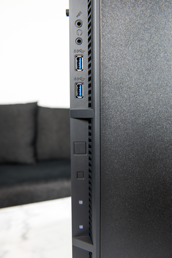 Frontpanelen på P8 hittar vi på frontens vänstra del väl integrerat i designen. Utbudet av portar är inget speciellt med 2 st USB 3.0, uttag för hörlurar och mikrofon, en reset-knapp och en startknapp, men även lampor för hårddiskaktivitet och ström.