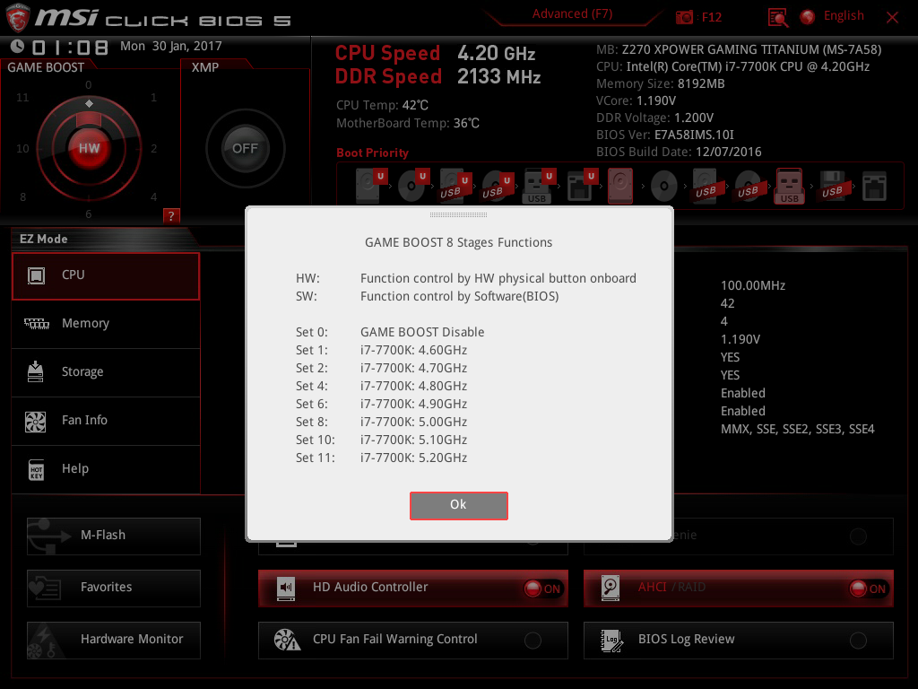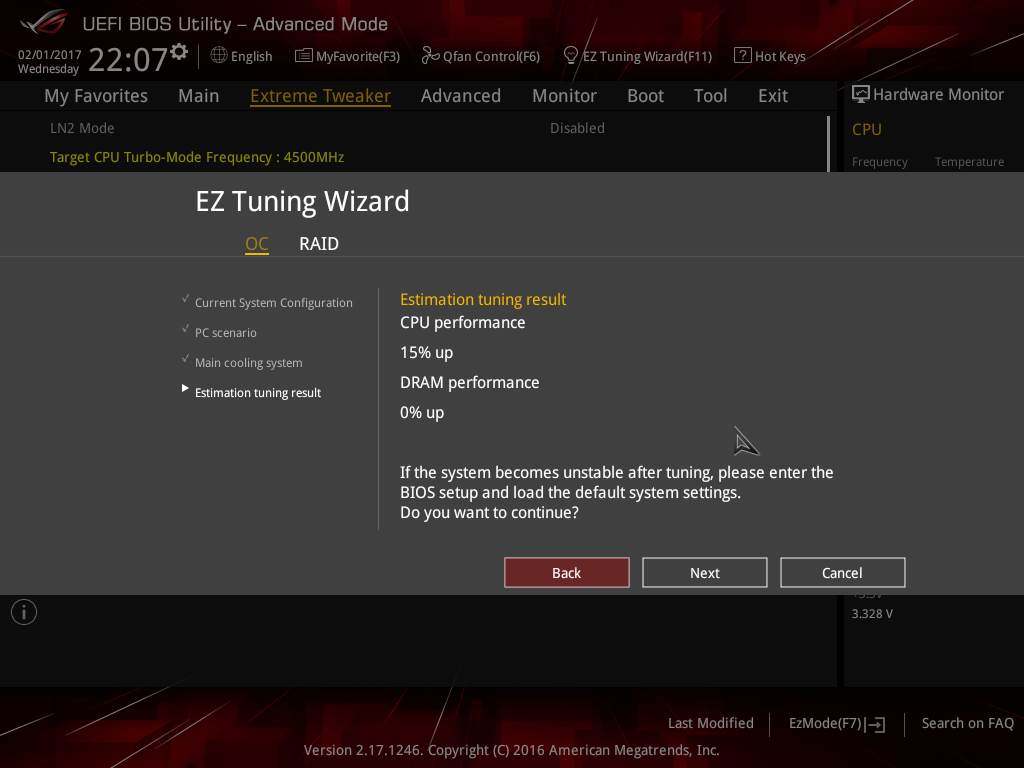 I vårt fall används en Intel Core i7-7700K tillsammans med en tornkylare från Noctua, vilket med EZ Tuning Wizard resulterar i en klockfrekvens på 4,8 GHz (multiplikator 48). Samtidigt ökar processorns kärnspänning med cirka 0,11 volt, vilket i sin tur innebär en något högre temperatur.