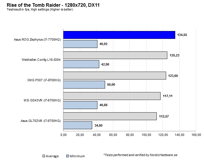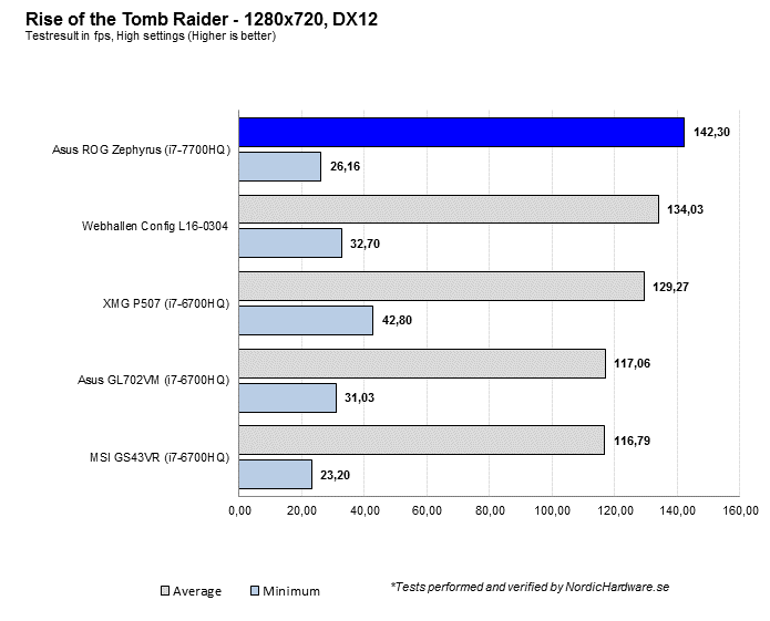 Tomb Raider har en belastningsbalans som väger tyngre på grafikkretsen och således så kommer ROG Zephyrus fram och kniper första platsen med sin GTX 1080 Max-Q GPU.