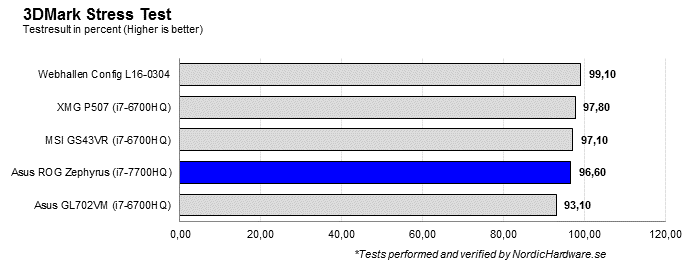 Trots att 3DMark Stress test är GPU-fokuserat så når ROG Zephyrus inte riktigt i hamn utan placerar sig strax under godkänd nivå. En förklaring till detta är återigen värmen som alstras från processorn som leder till trottling och instabilitet.