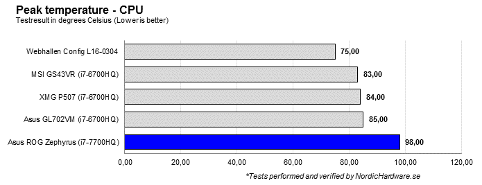Här kan vi enkelt identifiera en svaghet i designen hos ROG Zephyrus då processorn alstrar mycket värme. Du bränner dig inte på datorn vid användning men i full sytestisk belastning så når vi nära 100 grader vilket också leder till en hel del trottling. Detta är en förklaring till en del av de instabila resultaten vi sett i CPU-krävande tester.