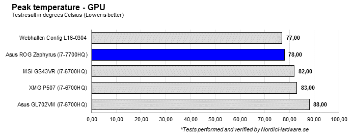 Vi ser helt andra temperaturresultat när det kommer till grafikkretsen. Det är uppenbarligen här som tillverkaren har lagt krutet med en temperatur på 78 grader vilket är imponerade i en sådan tunn laptop. En styrka i Max-Q-designen från Nvidia.