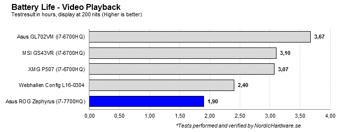 Vi testar batteritiden på datorerna med två olika tester: dels ett videotest och dels ett speltest. Speltestet är beräkningsintensivt och belyser till stor del skillnader i effektförbrukningen hos processorn. Videotestet är inte lika beräkningsintensivt, utan lägger mer vikt på en energieffektiv skärm och större batterier.