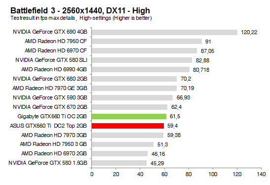 I en mycket högre upplösning på 2 560 x 1 440 har grafikkorten nästan det dubbla antalet pixlar att fylla. Trots att NVIDIA snålat lite med minnesbandbredden och grafikminnet i övrigt påverkar detta inte prestandan. GeForce GTX 680 ger fortfarande runt 20% högre prestanda än konkurrenten HD 7970 och föregångaren GeForce GTX 580 spelar inte ens i samma liga. Noterbart är också att GeForce GTX 680 troligtvis ger spelpar prestanda vid Ultra-inställningar även i 2 560 x 1 440 pixlars upplösning, detta utan de stutteringbesvär som multi-GPU-korten tenderar att ge i Battlefield 3.