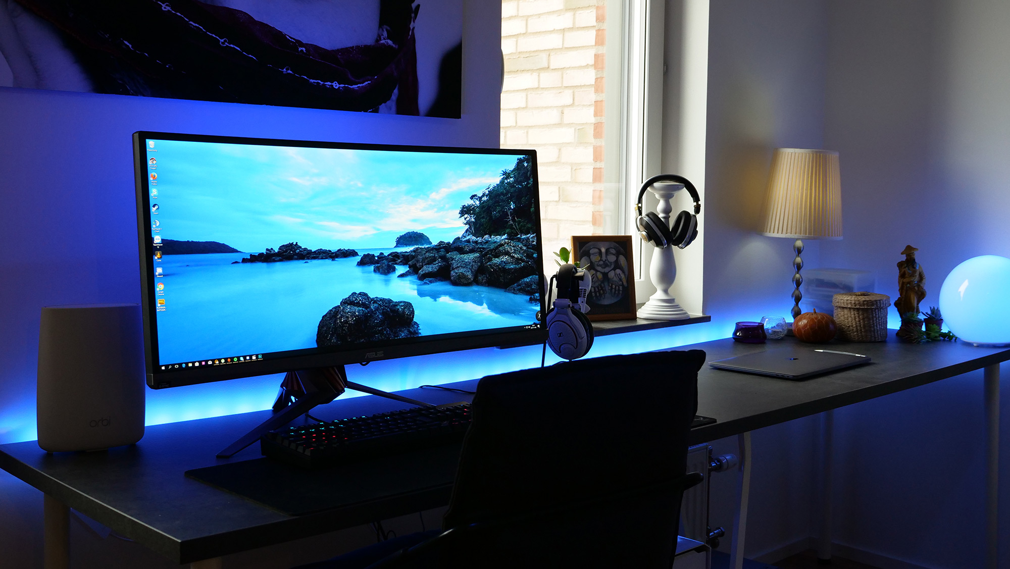 - Kontor – 1x Hue E27 RGB i taklampan, 1x Hue Light strip + förlängning runt hela skrivbordet, 1x Hue E14 Vit i bordslampa.