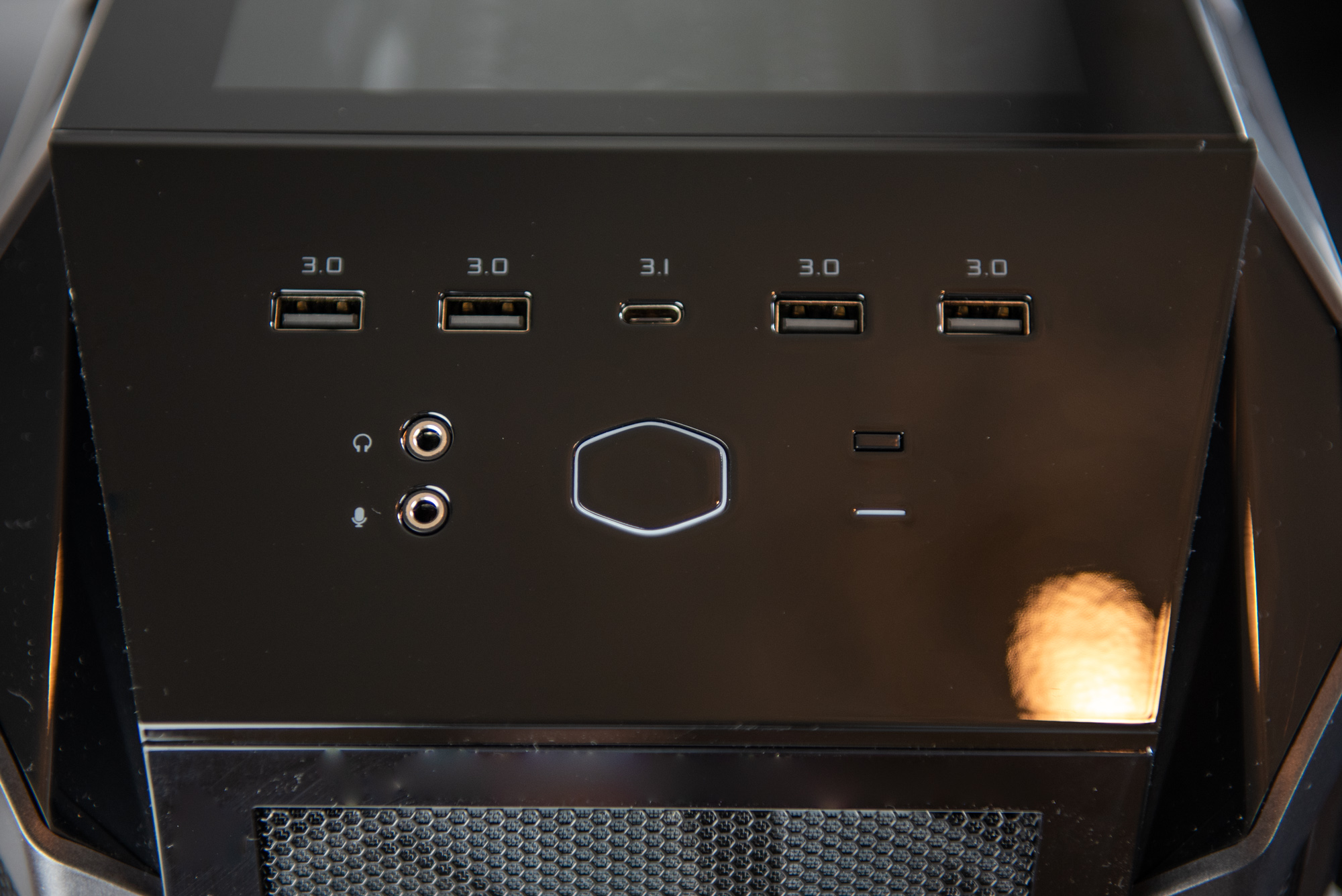 Frontpanelen på H500M hittas i toppens framkant, likt många andra chassin. Här finner vi ett bra urval av portar: fyra stycken USB 3.0, en USB 3.1 Typ-C, uttag för hörlurar och mikrofon, en startknapp och en reset-knapp. Reset-knappen kan även kopplas till den inkluderade RGB-kontrollen för att ändra färg på fläktarna. Det är alltså upp till användaren hur reset-knappen ska användas.