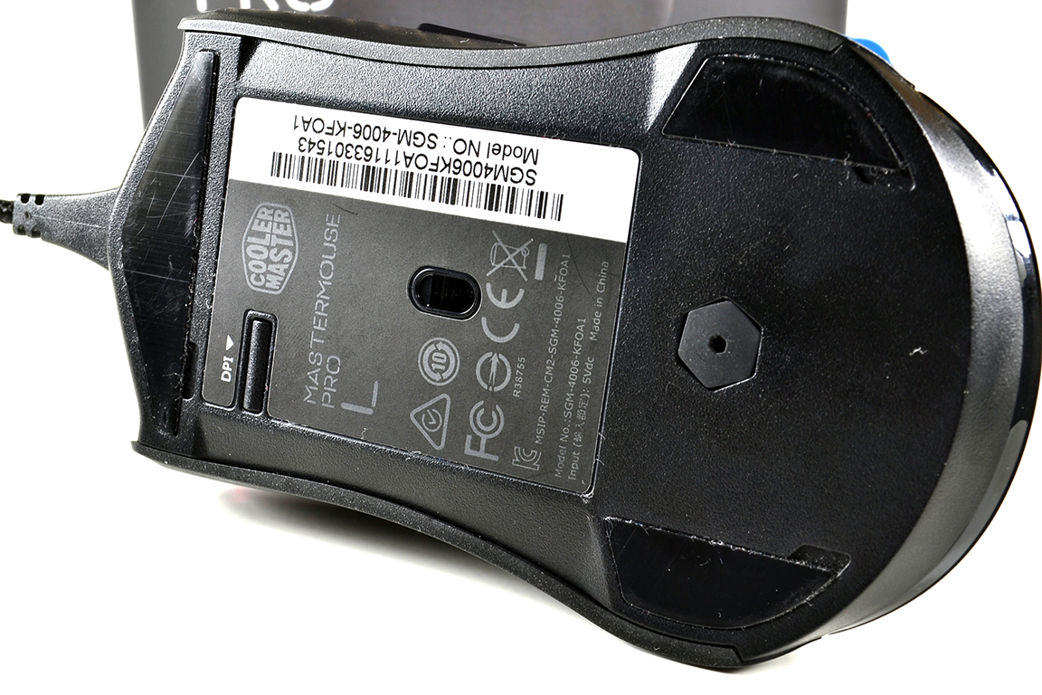 Vänder vi MasterMouse Pro L på sidan så ser vi tre glidytor, en centrerad sensor samt en hårdvaruknapp för skifte av DPI-nivåer. Bakom det sexkantiga gummiskyddet finns en skruv som måste lossas om man ska byta ovansidan.