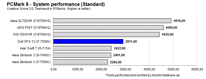 När grafikkretsen får dra en tyngre belastning noterar vi ett klart försprång för Dell XPS 13. Av allt att döma är det värmehanteringen som ger Dell en fördel vid den här sortens tung belastning.