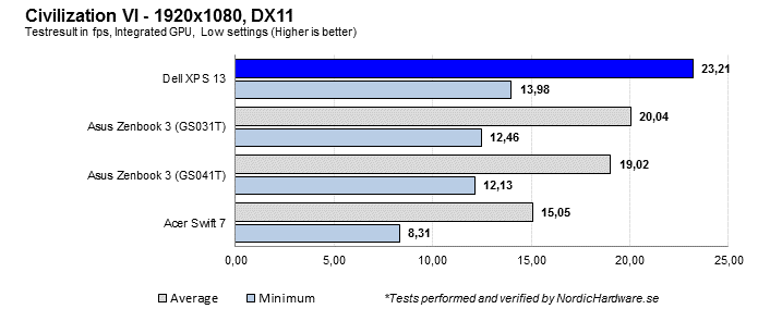 Det gäller små marginaler i 720p-upplösning med Directx 12 i den här titeln, och XPS 13 är snabbast endast med en enstaka bildruta per sekund. Däremot noterar vi att XPS 13 bibehåller sin bildfrekvens bättre när upplösningen ökas till 1080p.