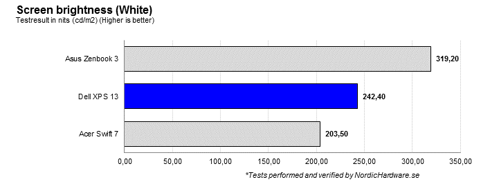 Här får XPS 13 helt klart se sig slagen av konkurrenten Asus. Som högst får vi ut 242 nits ur vårt exemplar, medan Zenbook 3 klarar över 300 nits. Då ska det dock också påpekas att XPS 13 har en matt skärmyta medan Zenbook 3 har en blank. Det innebär att XPS 13 påverkas mindre av reflektioner från omgivningen. Acer Swift 7 ligger dock värst till och klarar sig nätt och jämnt över 200 nits med en blank skärm.
