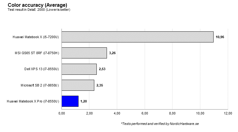 Allt under ett värde om 5 Delta E är bra och Huawei Matebook X Pro har den bästa skärmen vi testat i Svenska laptopguiden när det kommer till avvikelser i färgåtergivning.
