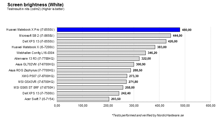 Huawei har inte sparat på krutet när det kommer till val av displaypanel och ljusstyrka i Matebook X Pro. Vi mäter 480 nits i vårt skärmtest vilket är det högsta resultatet i Svenska laptopguiden. Det är imponerade och det är inga som helst svårigheter att använda Matebook X Pro utomhus i soliga förhållanden.