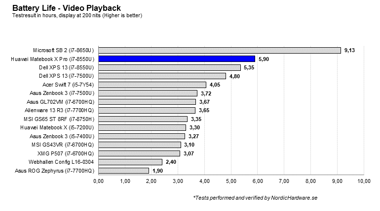 Matebook X Pro kniper en andraplats i vårt batteritest strax efter Microsoft Surface Book 2. En dator som använder dubbla batterier och är svår att slå när kommer till just batteritid.