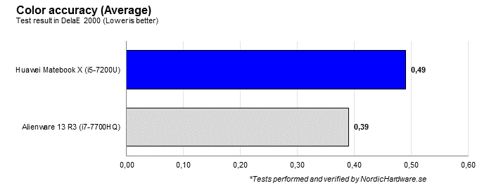 Huawei Matebook X har ett bra genomsnittligt Delta E-värde även om det är något högre än på Alienware 13 så är det fortfarande så pass lågt att det mänskliga ögat inte ska kunna uppfatta några färgavvikelser.