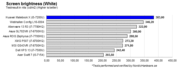 Matebook X har den ljusstarkaste skärmen vi testat i laptop-guiden hittills och det märks. Det är riktigt trevligt att kunna brassa på ljusstyrkan vid behov. Tex. När man är utomhus.