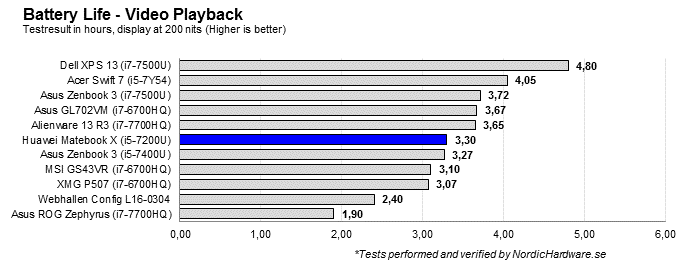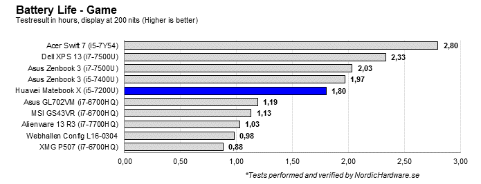 Matebook X är inte på något sätt en spelmaskin men resultatet ovan speglar det faktum att Huawei har förbättringsmöjligheter framför sig gällande batteritiden.