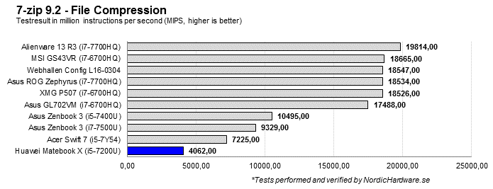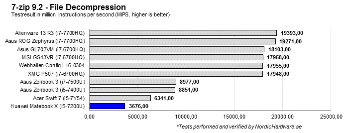 Arkivverktyget 7-Zip är ett oerhört populärt gratisprogram för komprimering och för uppackning av alla möjliga typer av filarkiv. Vi använder oss av 7-Zip för att testa hur snabbt varje bärbar dator klarar av att packa upp respektive komprimera en testfil, mätt i instruktioner per sekund.