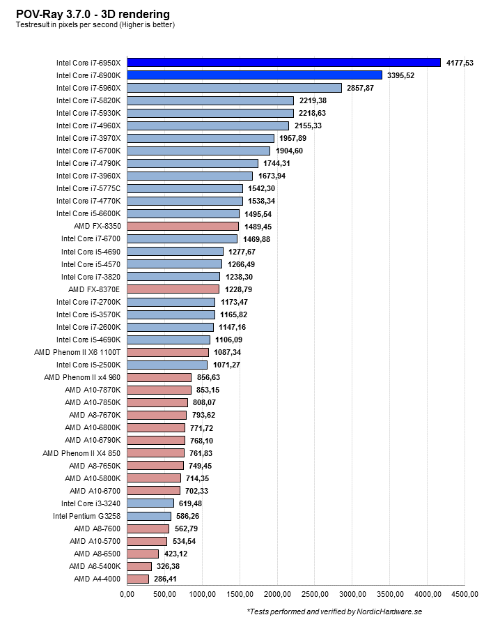 Ray tracing-testet POV-ray främjar användning av flera trådar, men vi kan även se en klar förbättring från i7-5960X till uppföljaren i7-6900K.