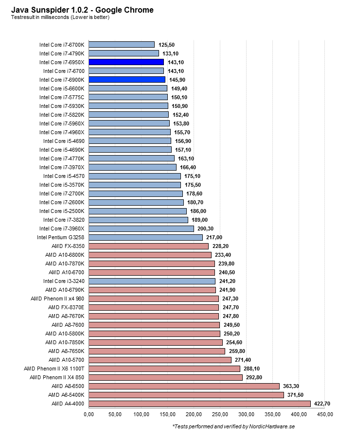 Sunspider ger ett resultat som motsvarar vad vi noterade i Kraken på föregående sida. Broadwell-E kan inte dra nytta av sina många trådar, och kärna mot kärna är ligger bland annat Skylake bättre till.