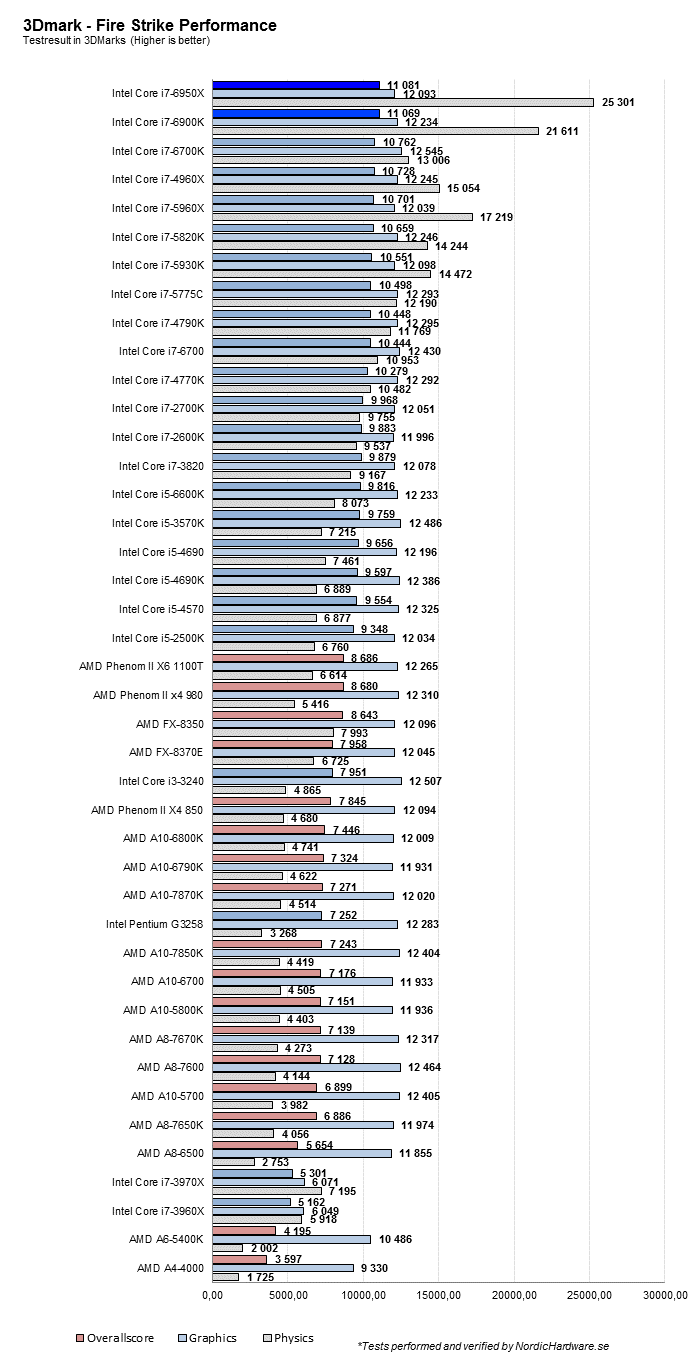 Samtliga processorer använder samma grafikkort, så grafikresultatet i 3DMark är i princip statiskt, och totalpoängen marginellt bättre för Broadwell-E än för föregångarna. Kikar vi specifikt på fysikdelen av testet ligger Broadwell-E oerhört bra till och piskar samtliga andra testade modeller.