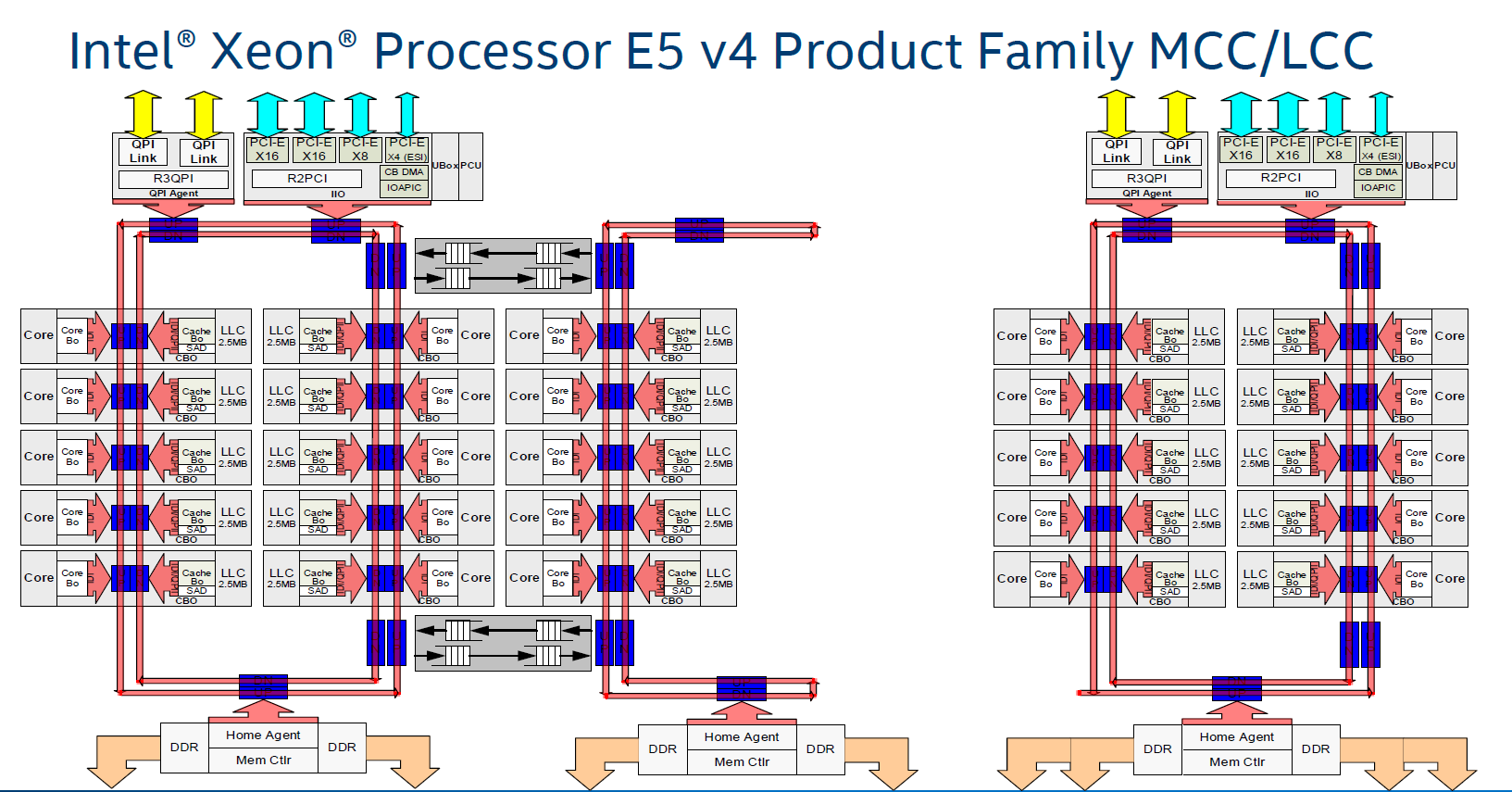 Processorernas interna struktur är i det stora hela oförändrad sedan Haswell-E, med processorkärnorna arrangerade i två kolumner – skillnaden är att den mindre tillverkningstekniken låter Intel klämma in fem kärnor per kolumn istället för fyra. De två kolumnerna är i sin tur sammanlänkade med en så “dubbelring”, bestående av två individuella ringformade datakanaler som skickar data i varsin riktning.