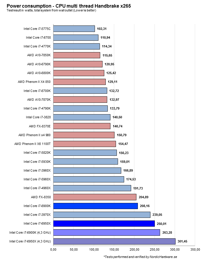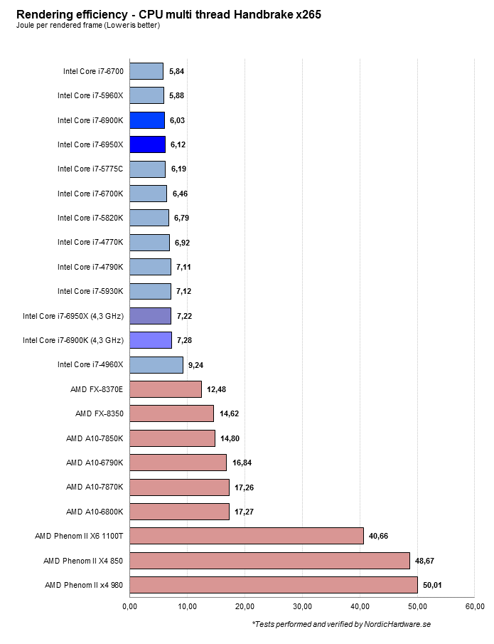 Väger vi energiåtgången efter prestandan så märker vi att effektiviteten faller något när så här hög spänning används. Det är dock inte omöjligt att mer detaljarbete med spänningen och frekvensen skulle kunna ge ett stabilt värde med en snarlik frekvens med en lägre spänning, vilket skulle kunna ge effektiviteten en knuff. Det får vi i så fall återkomma till i ett senare test.