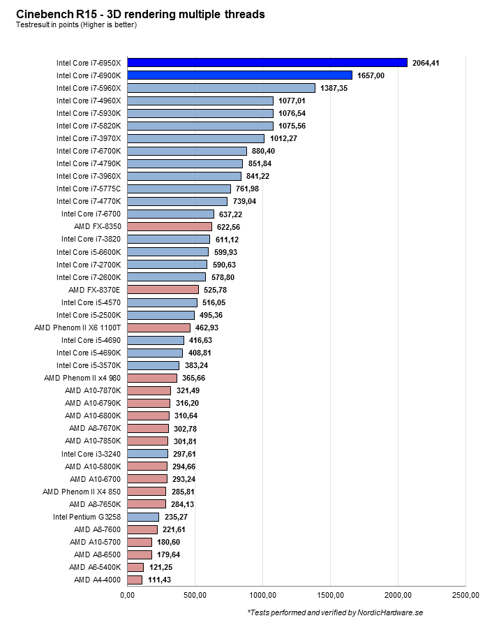 När alla kärnor istället får vara med så sopar den tiokärniga toppmodellen i7-6950X fullständigt banan med allt annat vi har testat hittills. Det är dock inte bara antalet kärnor som påverkar resultatet, då i7-6900K bibehåller ett friskt försprång över den i7-5960X med samma mängd kärnor – rimligtvis beror det både på högre prestanda per klockcykel och snabbare minneskontroller.