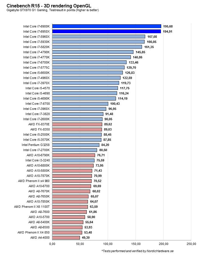 Testar vi OpenGL-rendering ligger Broadwell-E fortfarande i topp med en tydlig marginal, men intressant nog är marginalen mycket liten mellan den åttakärniga och den tiokärniga varianten; här spelar minneskontrollern en större roll, och de två modellerna har matchande bandbredd. Strax därefter ligger föregångaren Haswell-E, som även den plattformen kör fyra DDR4-kanaler men med lägre frekvens.