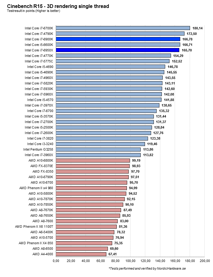 Med en aktiv kärna rår Broadwell-E inte riktigt på de billigare flaggskeppen i7-6700K eller i7-4790K, vilket till stor del bör beror på högre turbofrekvenser hos de modellerna. Både i7-6950X och i7-6900K ligger dock högt upp, och här är i7-6900K något vassare än sin dyrare storebror i och med sina högre frekvenser.