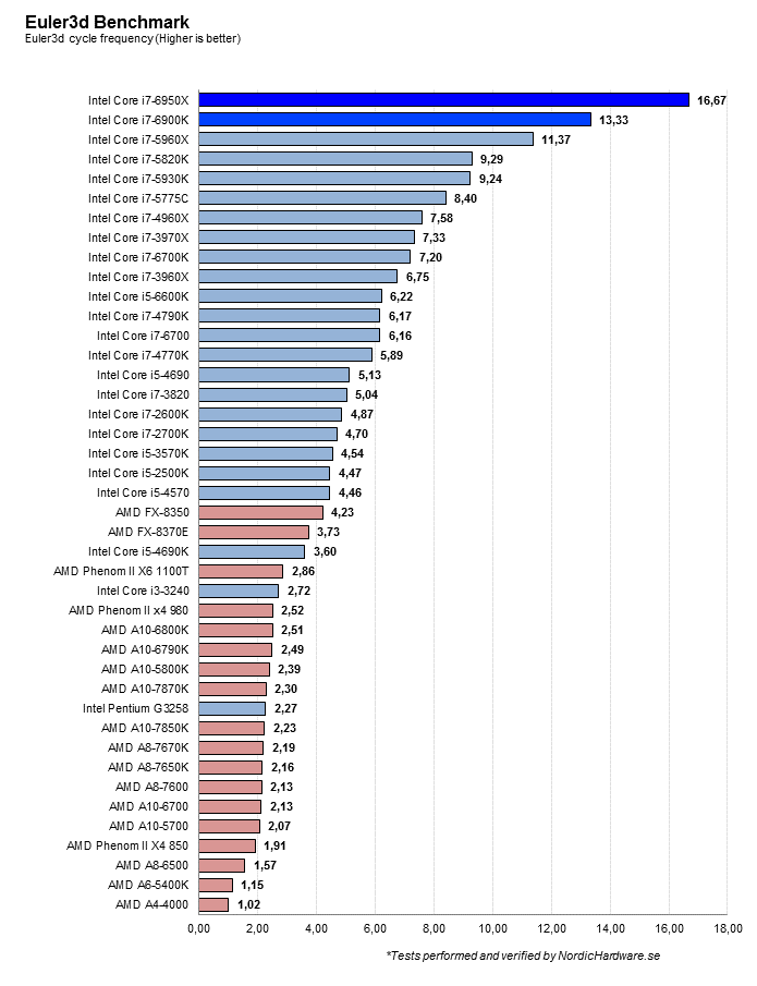 Euler3D är flertrådsoptimerat och minnestungt, så det snabbare minnet och antalet trådar placerar Broadwell-E stadigt högst upp.