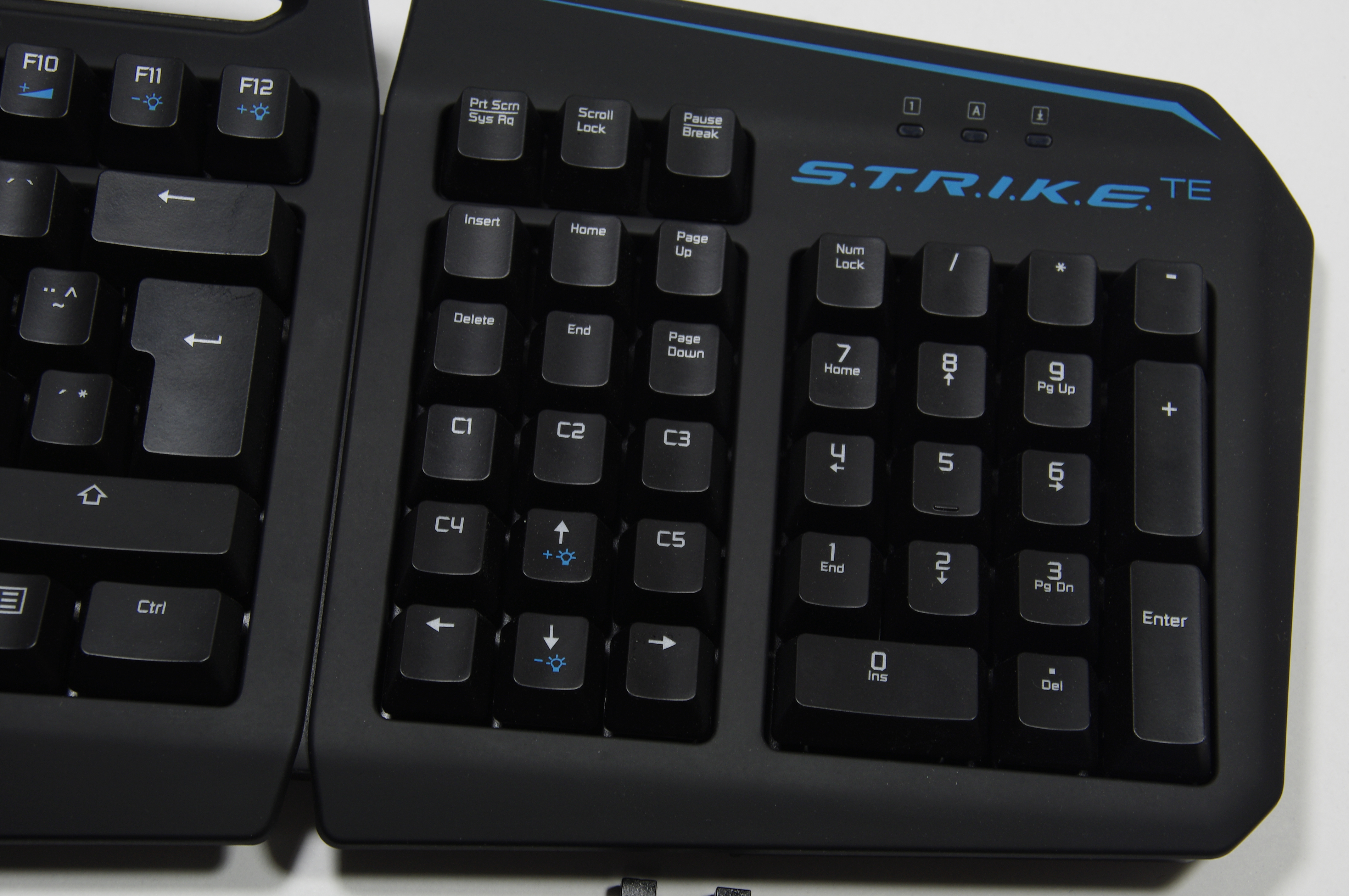 S.T.R.I.K.E TE har 13 olika makrotangenter totalt. Sju av dessa sitter upp till, de sitter lite långt ifrån WASD-klustret och är inte riktiga tangenter utan knappar. De resterande fem makrotangenterna fyller ut utrymmet mellan piltangenterna och navigationsklustret. Det blir väldigt ovant om man är van att hitta navigationstangenterna med hjälp av kanterna. Det är dock en en bra användning av ett utrymme som i vanliga fall bara är död yta. Även om tangentbordet har gott om makrotangenter så känns det verkligen inte som ett MMO-tangentbord, makrotangenterna sitter alldeles för långt ifrån wasd-klustret för att de snabbt ska vara tillgängliga. Men det är absolut trevligt att ha makrotangenterna och programmeringsmöjligheterna är mycket goda.