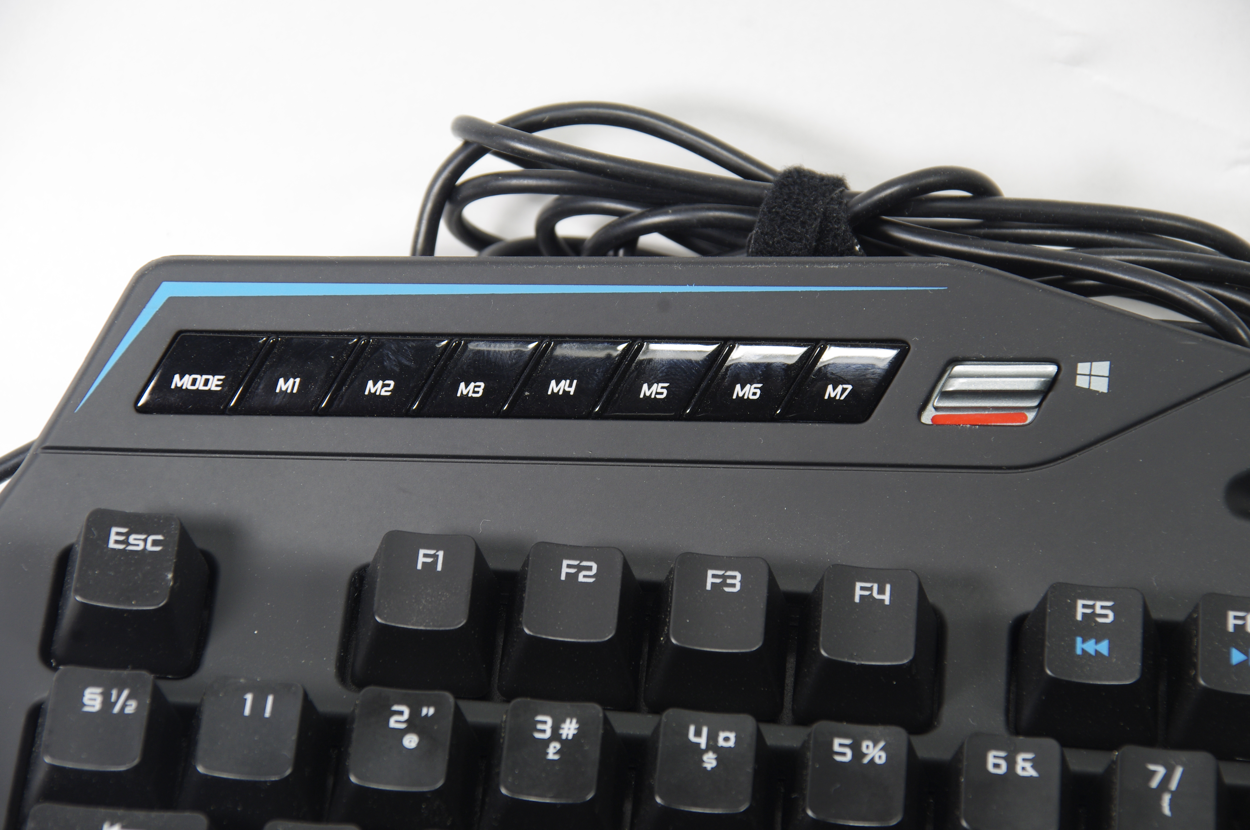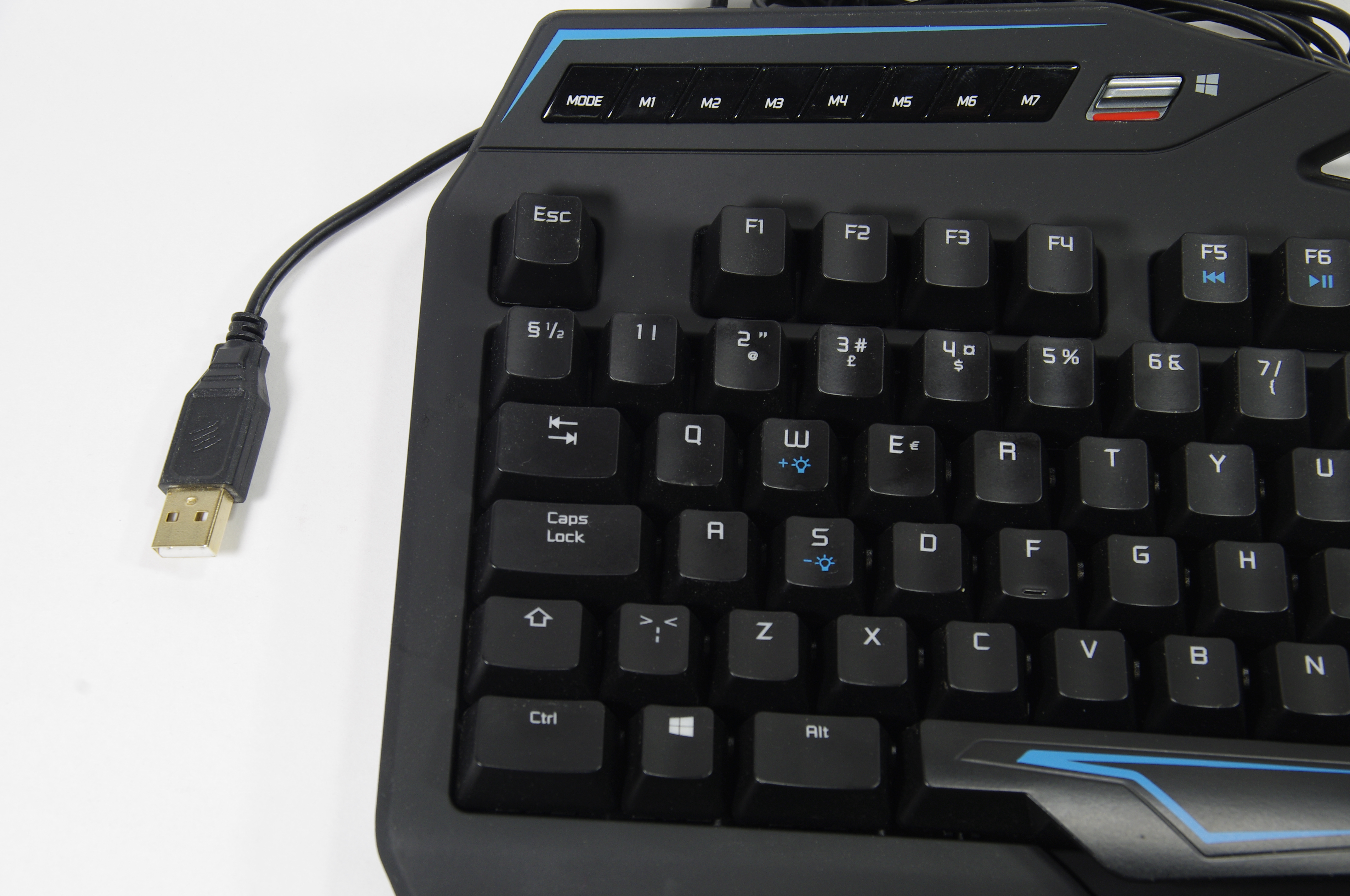 I överkant så sluttar tangentbordet uppåt och här sitter sju stycken makrotangenter och en switch för att stänga av windowstangenten. I överkant ganska precis mitt på tangentbordet finns ett hål, har man extremt små händer skulle det kunna fungera som ett handtag annars är det främst ännu en designdetalj. Med den mattsvarta ytan och de blå detaljerna så är tangentbordet stilfullt i sin design. Förutom de detaljer vi redan nämnt så sticker tangentbordet ut med sin speciellt utformade mellanslagstangent. Istället för att ha en standard rektangulär mellanslagstangent så har tangentbordet en special utformad tangentopp för mellanslagstangenten med en utökad slagyta som till en början känns lite konstig och ser lite konstig ut. Men efter cirka en timmes användning så växer den på en och tummens placering under spelsessioner blir lite bekvämare.