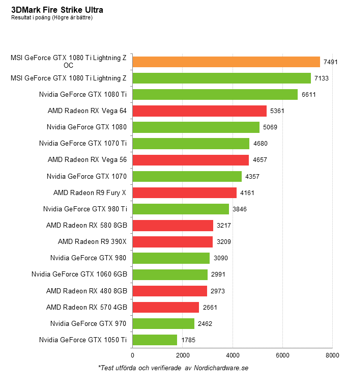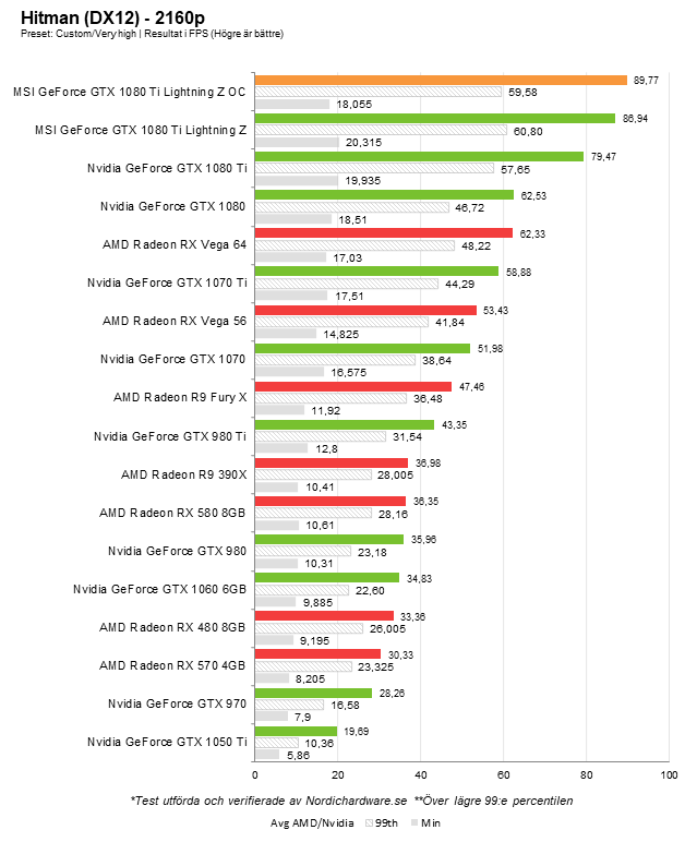 Men det finns mer att hämta för den som vill och efter våra tester landade vi på en överklockning på ungefär 4 procent i boost och 9 procent i minnesfrekvens. Det är en skaplig överklockning för ett grafikkort som erbjuder redan höga frekvenser. Det finns dock mycket mer att hämta för den som vill det då det här kortet är särskilt anpassad för överklockning med flytande kväve. Vi nöjer oss dock med luftkylning och tycker att den stabila överklockningen på lite över 4 procent är acceptabel. Överklockningen ger en prestandavinst på ungefär 4 bilder per sekund mer i Hitman på upplösningen 2160p, eller lite mer än 300 poäng mer i Fire Strike Ultra.