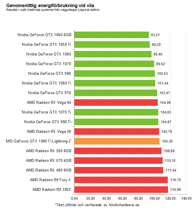 Det är inget mycket som skiljer när vi tittar på grafen över den genomsnittliga förbrukningen i vila där vi ser att Lightning Z drar något mer från väggen än referenskortet, men också alla andra referensmodeller från Nvidia. Det är dock små marginaler som skiljer samtliga kort åt.