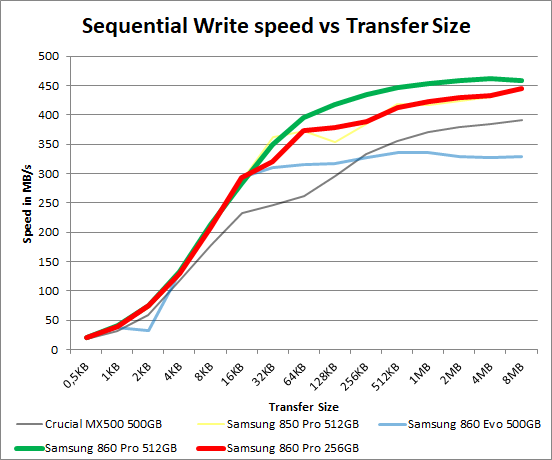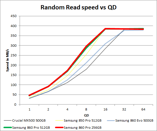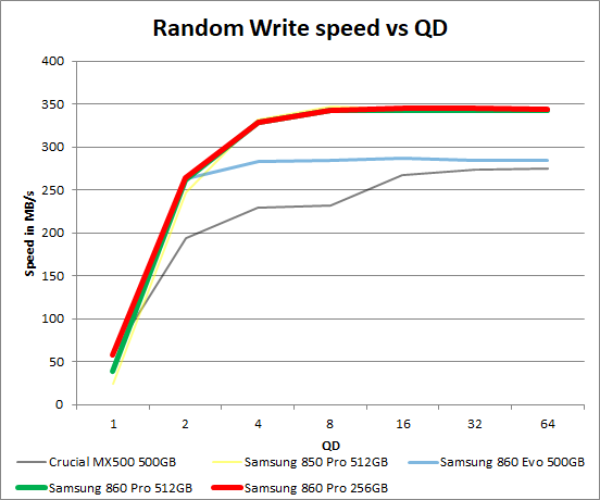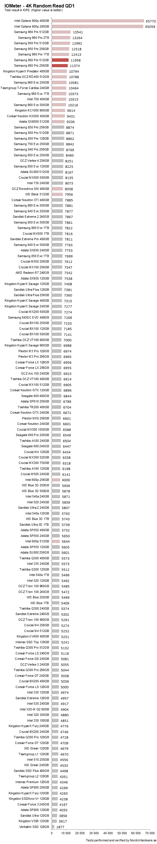 Här däremot ser vi att det händer grejor. 860 Pro är betydligt bättre än alla andra SATA-enheter och slår en hel del PCIe-enheter till och med. Mäkta imponerande resultat från båda 860 Pro enheterna. Det är tydligt att Samsung hittat ett ställe där man kunde göra förbättringar.