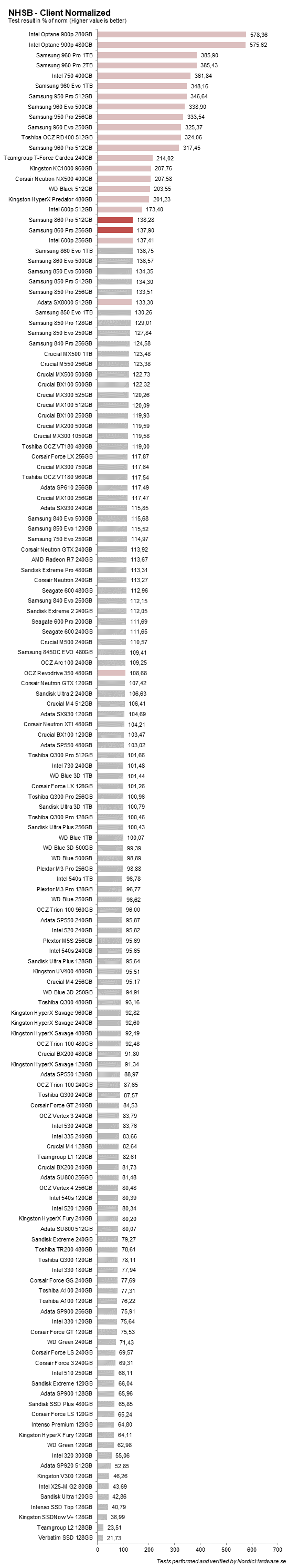 Första diagrammet är en sammanställning av våra tre NHSB Client-tester (Game, Office och Editor). Baserat på den data vi hittills samlat ihop räknade vi ut ett medel för vad en normal SSD presterar. Det värdet motsvarar 100 procent. I diagrammet nedan har vi jämfört varje enhet med det värdet i respektive test och fått fram en bra sammanställning. Vi har inkluderat diagram för varje enskilt test längre ner.