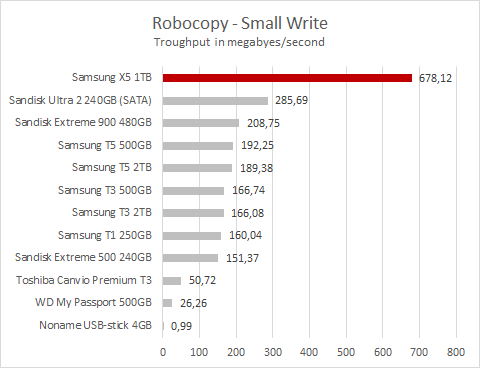 Ja det är inte mycket att orda om. Samsung X5 är den överlägset snabbaste externa enheten vi någon sin har testat. Nu hade vi ju inte förväntat oss något annat heller, men det är ändå mäktigt att se hur mycket snabbare den här enheten är jämfört med de andra.