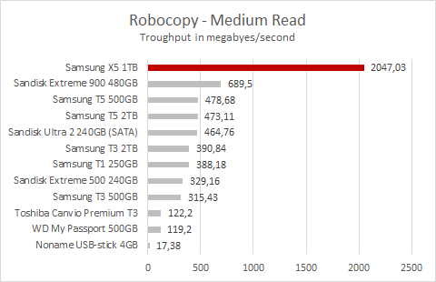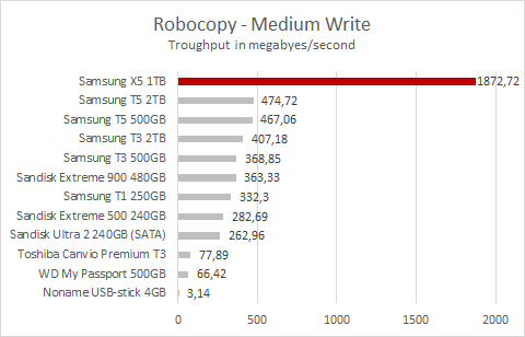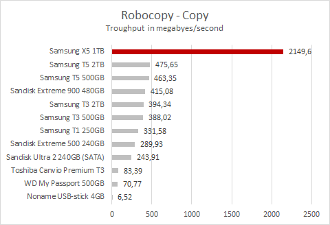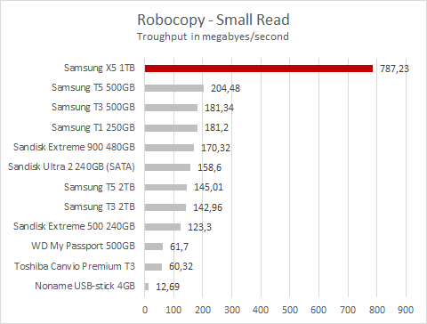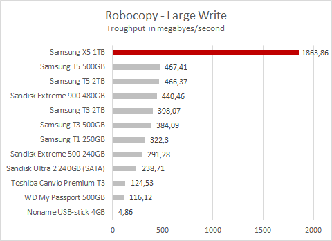 Ja det är inte mycket att orda om. Samsung X5 är den överlägset snabbaste externa enheten vi någon sin har testat. Nu hade vi ju inte förväntat oss något annat heller, men det är ändå mäktigt att se hur mycket snabbare den här enheten är jämfört med de andra.