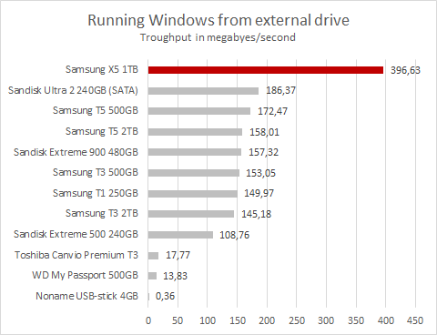 Om man istället vill köra en VM med Windows från sin externa enhet så fungerar Samsung X5 ganska bra för det också. Enligt våra tester så går det bättre att köra en Windows installation på Samsung X5 än på en intern SATA SSD. Det är tydligt att det finns prestanda så det räcker i Samsungs nya enhet.