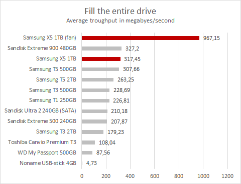 Det är tydligt att Samsung X5 har problem med värme om den ska skriva mycket data kontinuerligt. Utan fläkt är Sandisk Extreme 900 något snabbare än X5. Men om vi låser en fläkt blåsa över enheten så är bilden helt annorlunda och snitthastigheten blir helt plötsligt 3 gånger så hög.