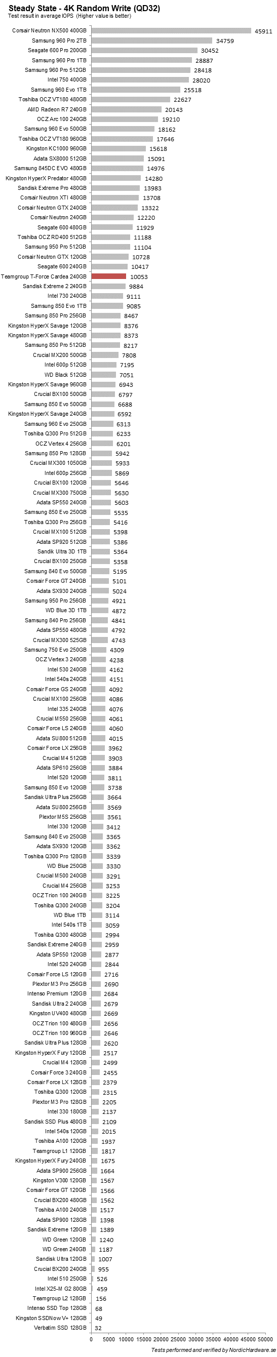 T-Force Cardea har förhållandevis lite overprovisioning och går därför ner i steady-state på kort tid. Efter det så håller man en hög medelprestanda på över 10 000 IOPS. Dock så är det ganska stor variation och en neråtgående trend ju längre testet kördes. Trots det ett godkänt resultat för en så pass liten enhet.
