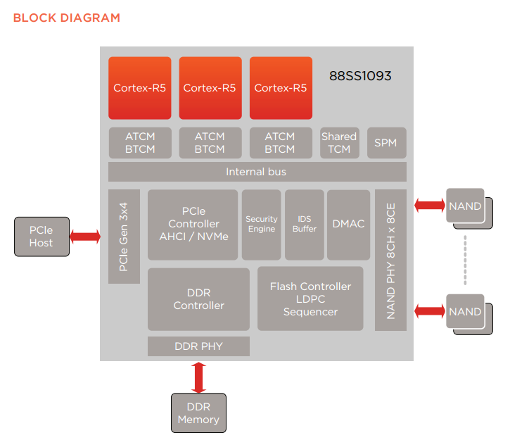 Marvell 88SS1093 är en 8-kanalskontroller som i botten bygger på tre stycken ARM Cortex-R5 processorer på “upp till” 500 MHz. Kontrollern har stöd för att nuvarande MLC- och TLC-implementationer (inklusive 3D-NAND) samt stöd för både NVMe 1.1 och AHCI 1.3. Likt många andra kontrollerkretsar använder man fyra banor med PCI-Express 3.0