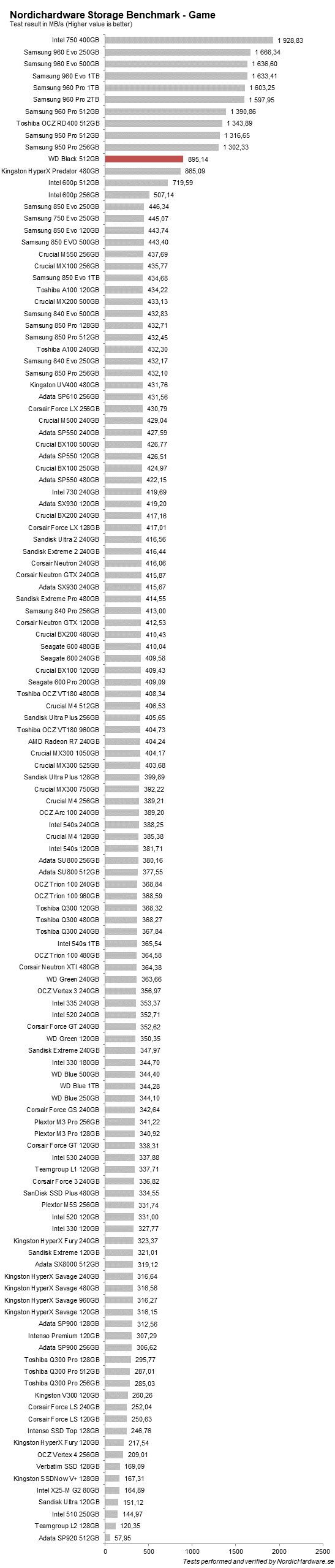NHSB-Game brukar vara ett av de tester som tydligast talar om hur en enhet står sig för de flesta konsumenter. I det här fallet placerar sig WD Black som en enhet som är långsammare än de dyrare MLC-baserade PCIe-enheterna, men samtidigt märkbart snabbare än Intels 600p.