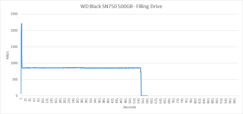 Om vi tittar på hela testet ser vi tydligt att 500 GB-modellen aldrig pressar kontrollern tillräckligt för att den ska överhetta. 1 TB-modellen börjar däremot få problem med värme efter ungefär 100 sekunder. WDs överhettningsskydd är dock väldigt binärt och det finns inga mellansteg alls. Det är antingen fullt ös eller nästan ingenting alls.