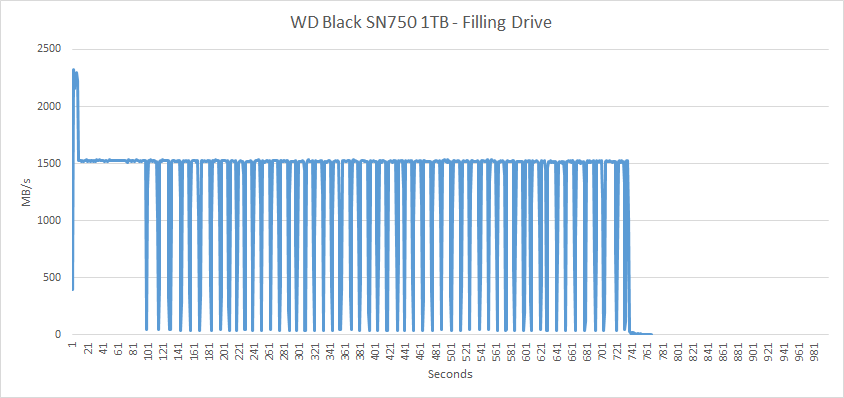 Om vi tittar på hela testet ser vi tydligt att 500 GB-modellen aldrig pressar kontrollern tillräckligt för att den ska överhetta. 1 TB-modellen börjar däremot få problem med värme efter ungefär 100 sekunder. WDs överhettningsskydd är dock väldigt binärt och det finns inga mellansteg alls. Det är antingen fullt ös eller nästan ingenting alls.