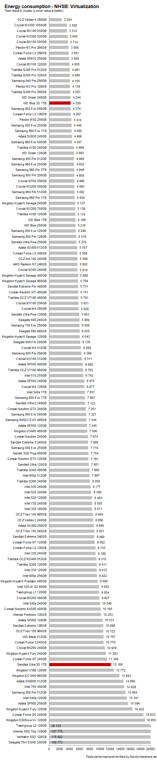 WD Blue 3D ser ut att vara en av de mest energisnåla 1TB enhetena som vi testat. Det är tydligt att BICS drar mindre ström under belastning och det är positivt för alla inblandade. Det båda också gått inför framtiden.